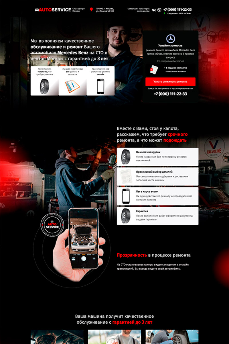 - Продающий визуал — фото "до/после" ремонта, видео с диагностики, слайдер с акциями и популярными услугами, карта проезда.