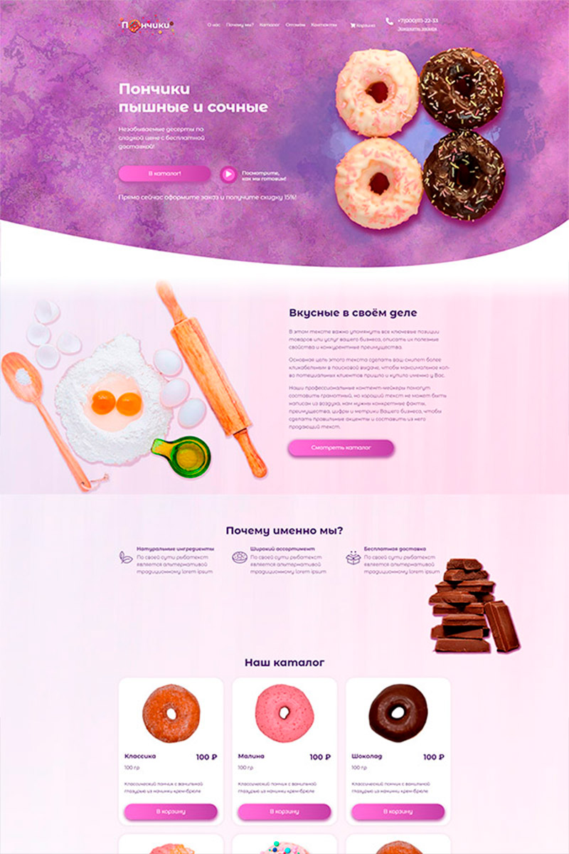 - Добавьте каталог с фильтрами по вкусу (ваниль, шоколад, клубника), начинке (джем, крем, карамель), типу (классические, мини, пончики-бомбы).