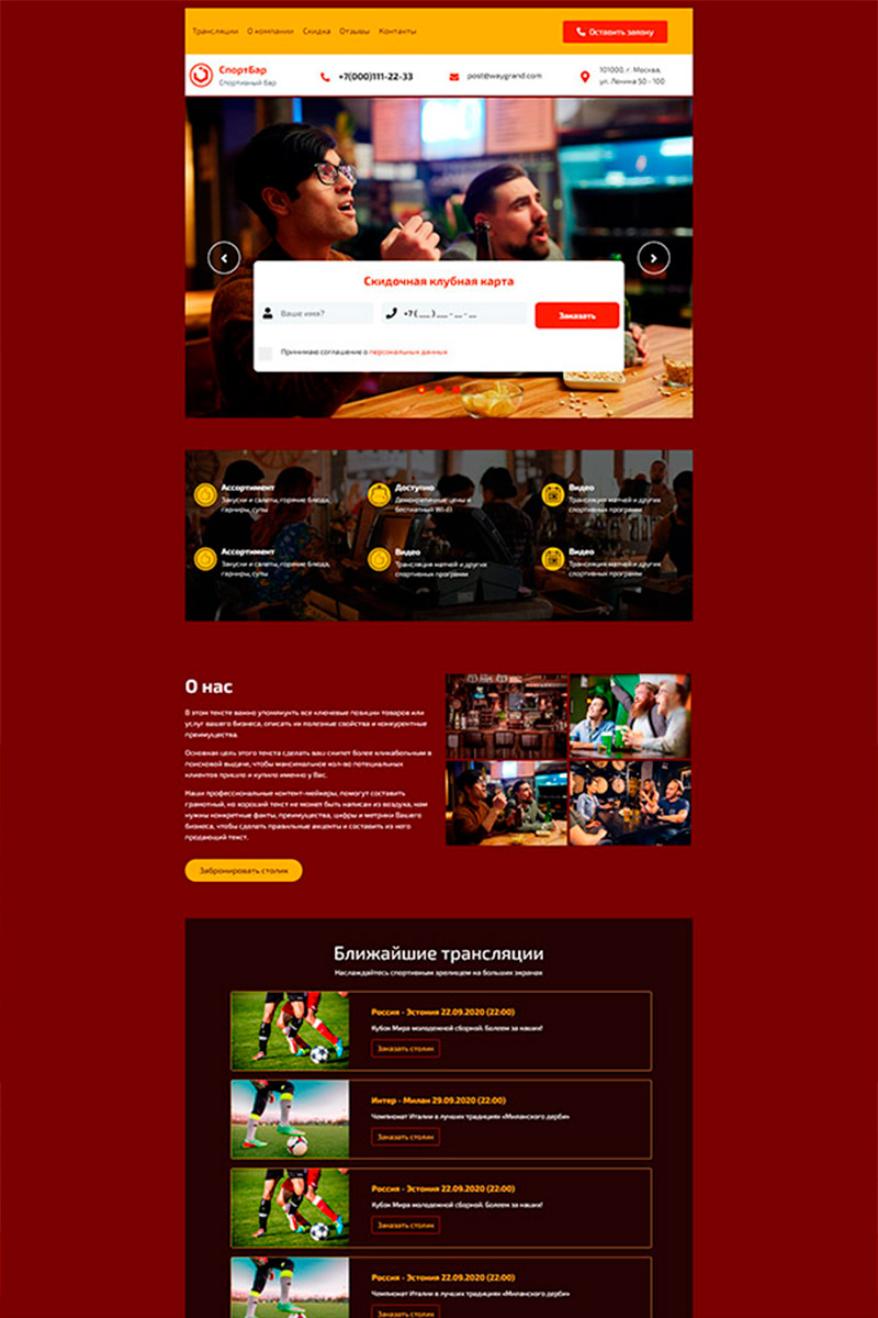 - Удобную навигацию — посетители быстро находят расписание матчей, меню, фото интерьера, зону бронирования и контакты.