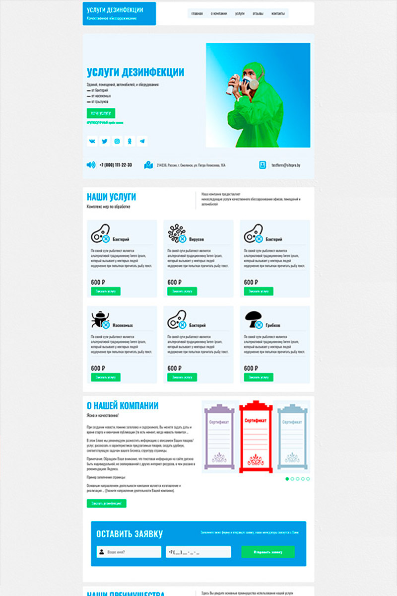 - SEO-оптимизированную структуру — чистая архитектура, правильные заголовки и метатеги помогают быстрее попадать в топ по запросам вроде «дезинфекция квартиры от вирусов», «обработка от клопов под ключ», «санитарная обработка кафе по СЭС».