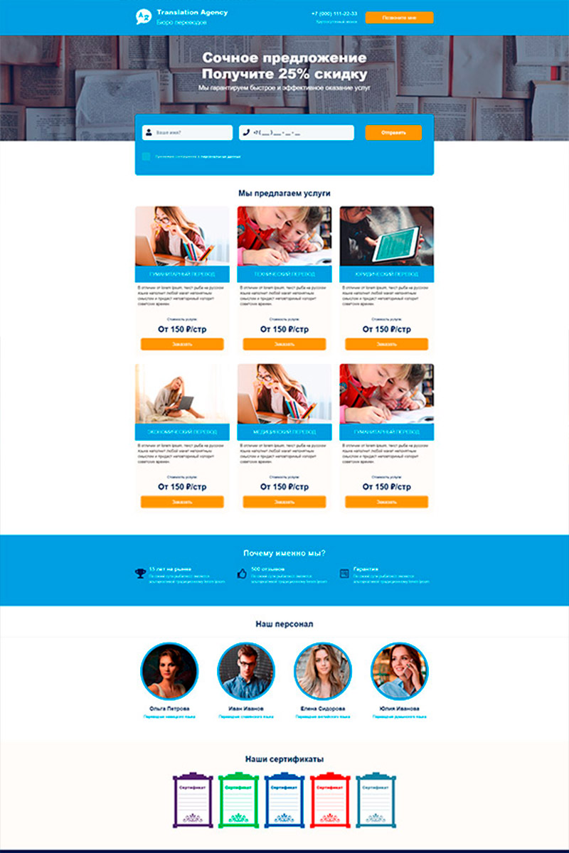 - Продающий сайт с профессиональным дизайном, вызывающий доверие и ассоциирующийся с надёжным бюро переводов