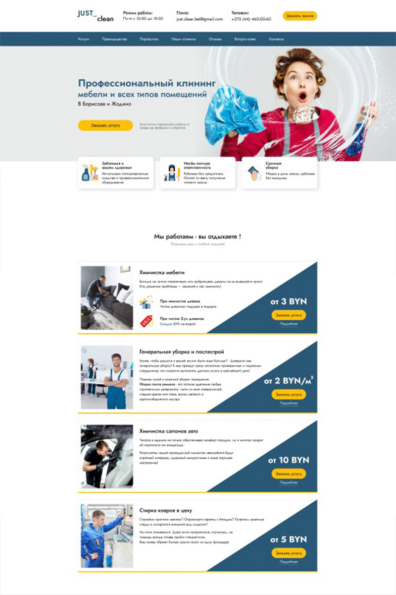 - Продающий сайт с чистым, современным дизайном и эффектом профессиональной клининговой компании