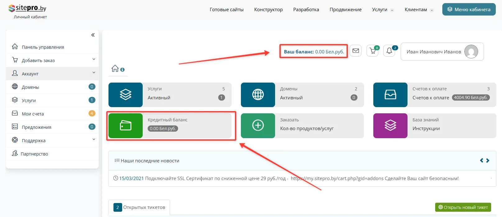 В вашем личном кабинете Вы всегда можете видеть ваш баланс на текущий момент. Чтобы его пополнить, зайдите в "Кредитный баланс"