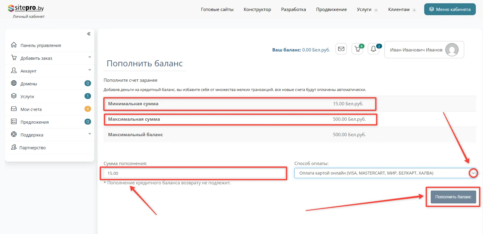 Чтобы пополнить баланс в личном кабинете, воспользуйтесь этой инструкцией: