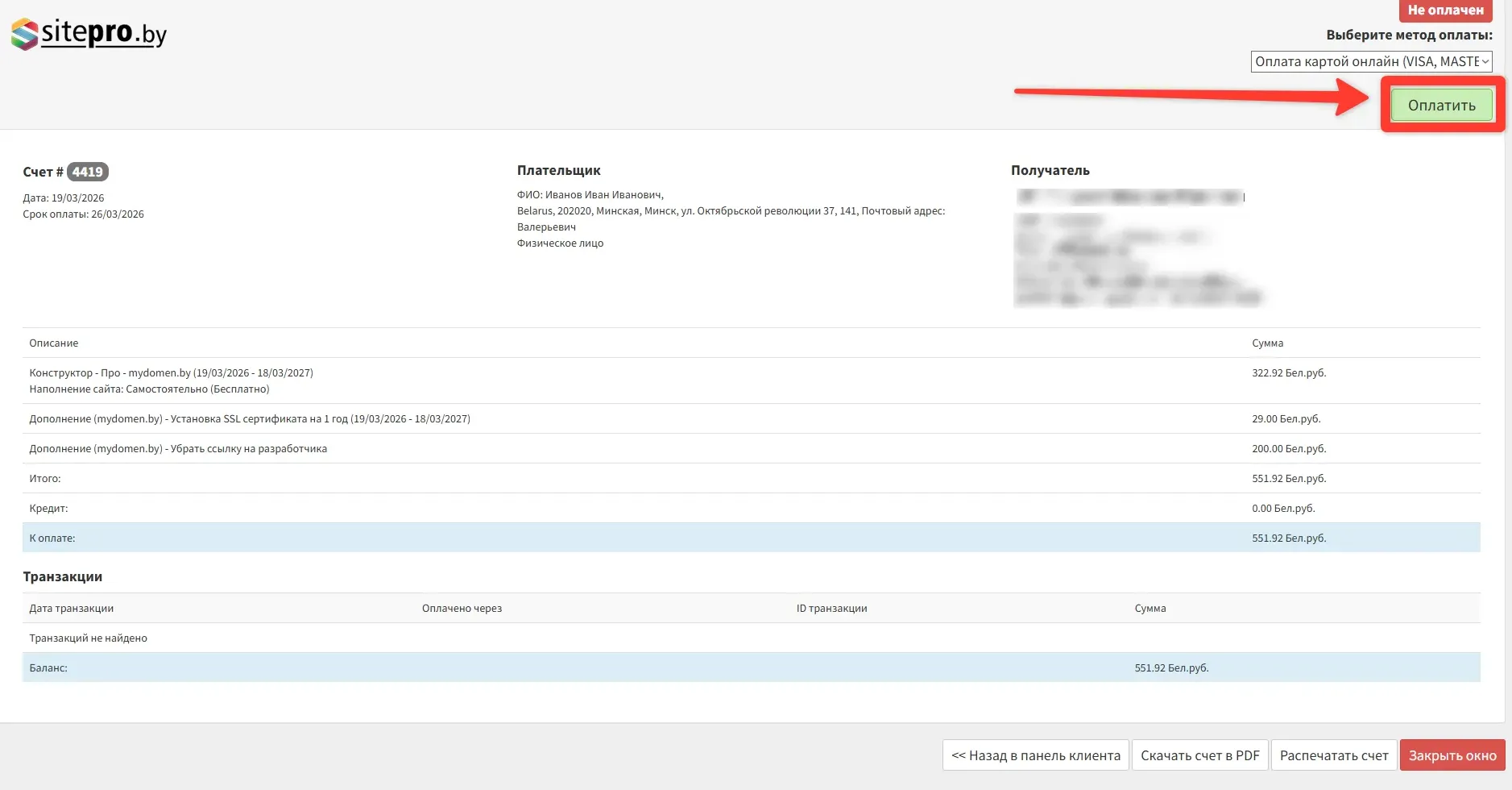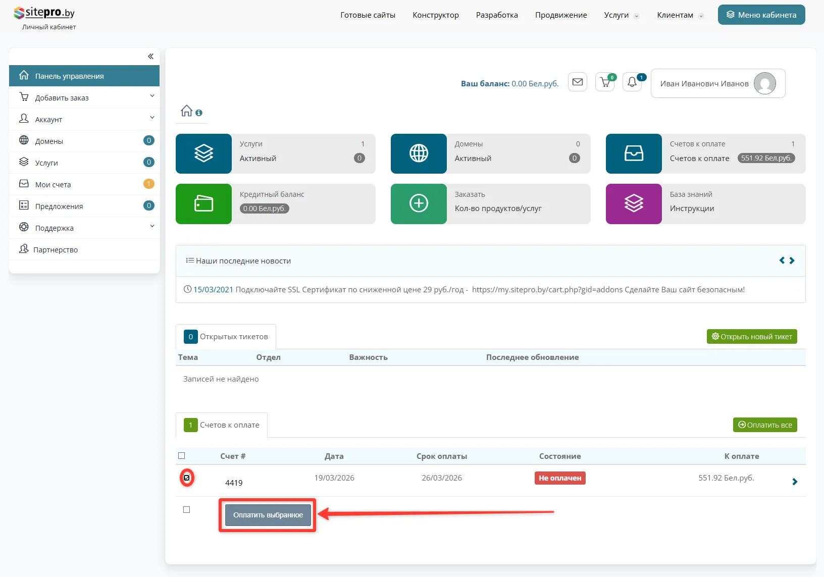 6. Выберите счёт и нажмите кнопку "Оплатить выбранное"