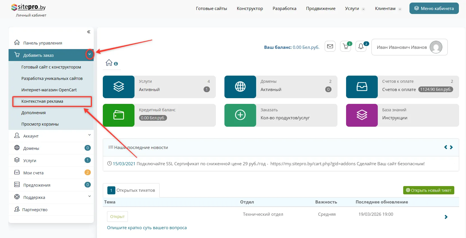 Чтобы сделать заказ на услуги в личном кабинете клиента, следуйте этой инструкции: