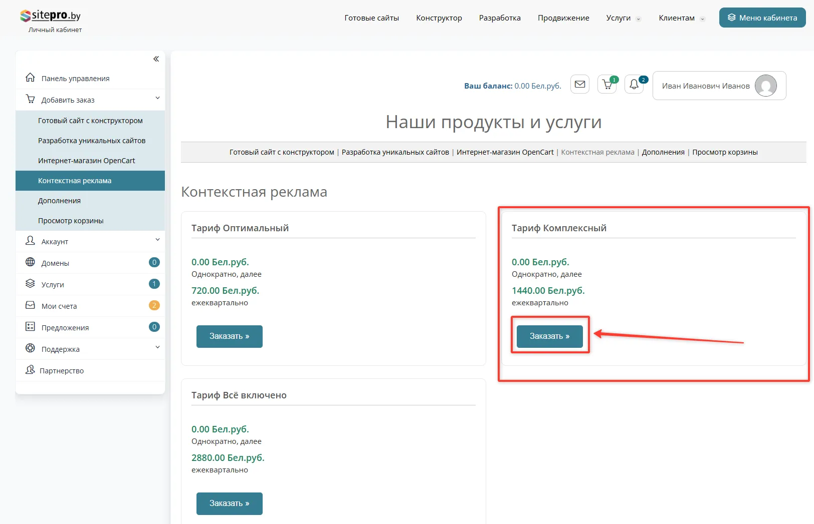 2. Выберите тариф и нажмите кнопку "Заказать"