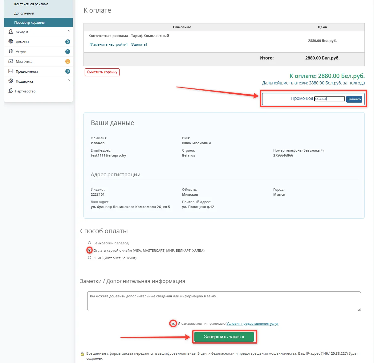 4. Заполните поля по примеру со скриншота и нажмите кнопку "Завершить заказ"