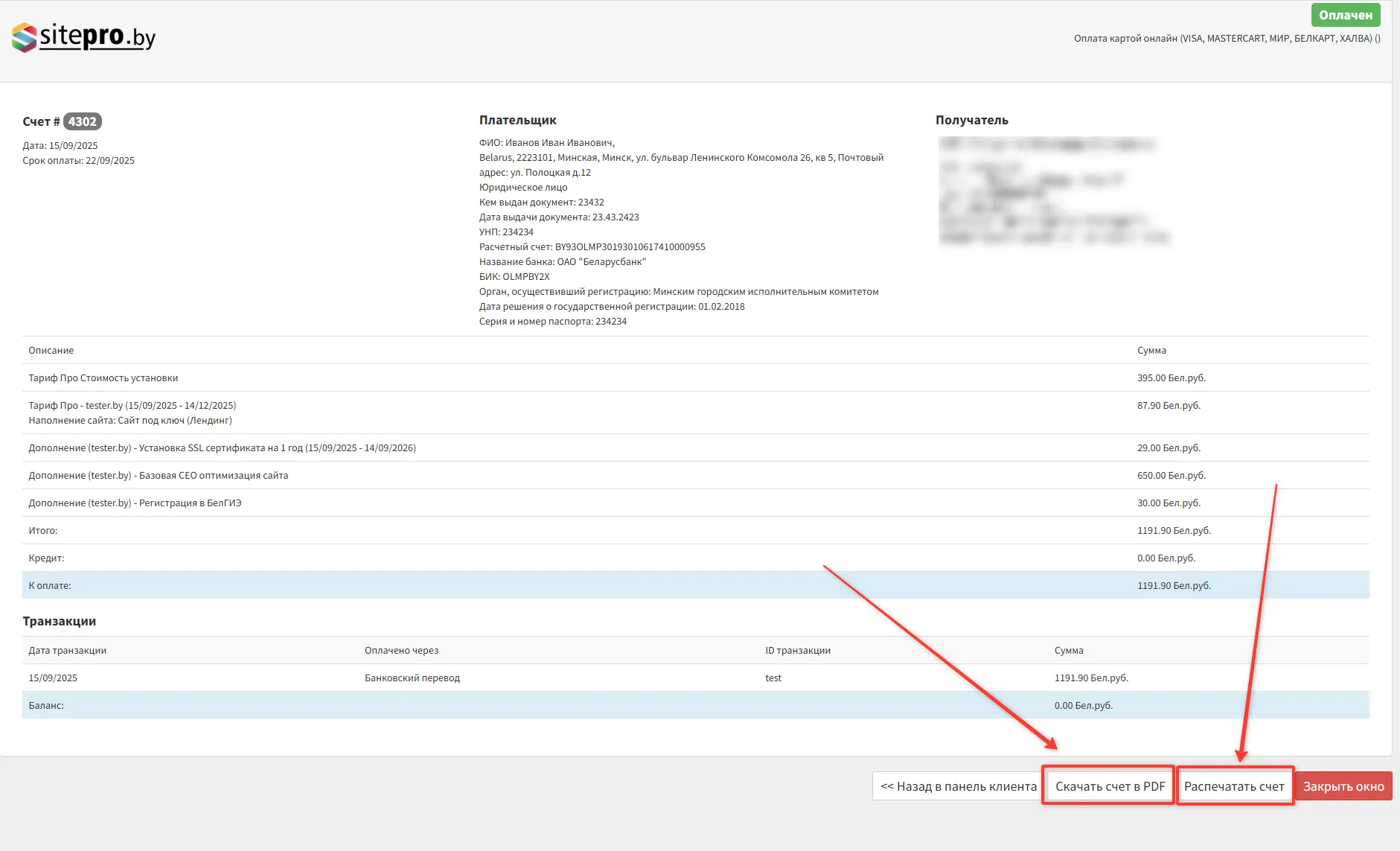 Можете скачать файл в формате PDF нажав кнопку "Скачать счет в PDF" или просмотреть содержимое нажав кнопку "Распечатать счет"