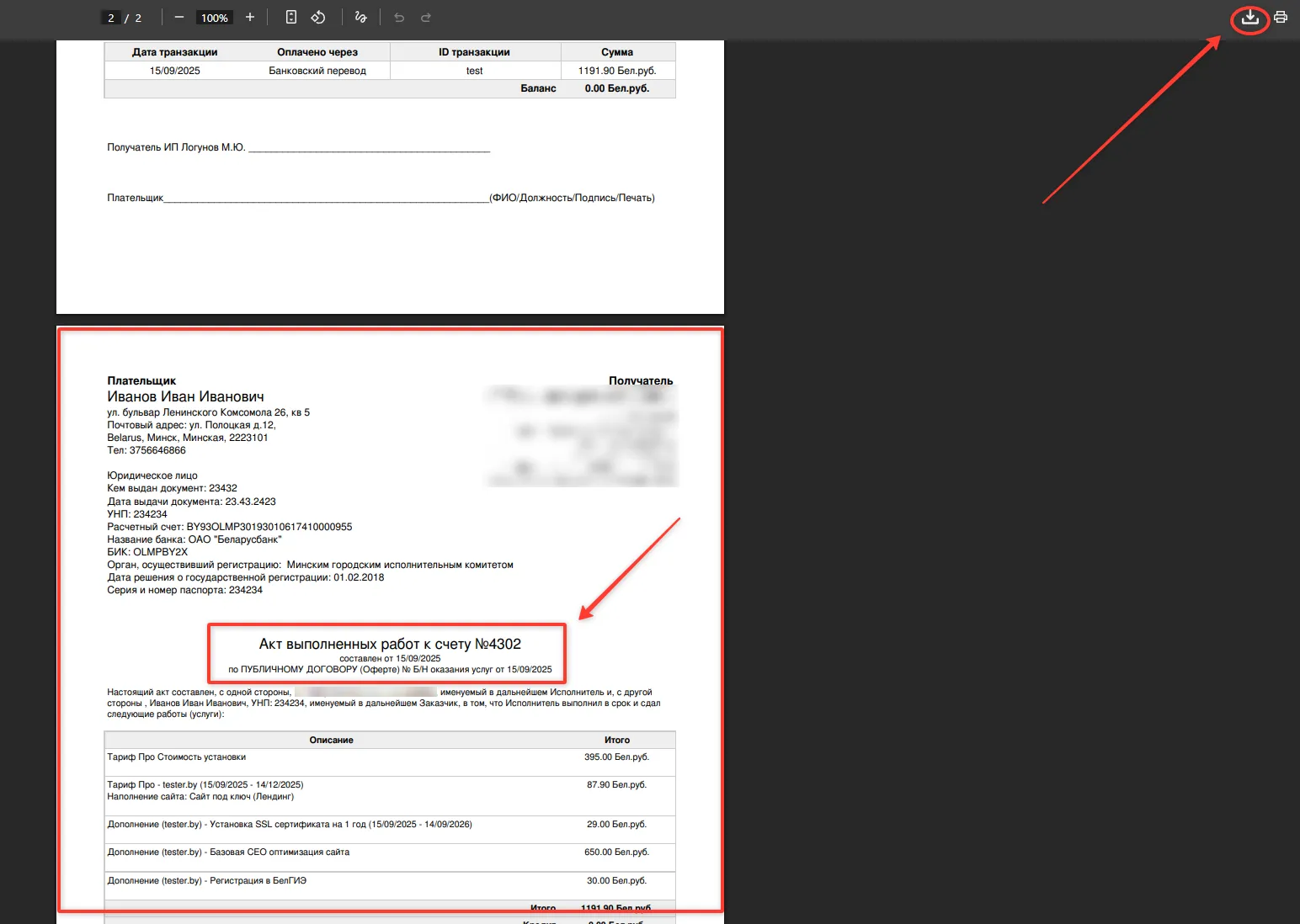 Если Вы выбрали "Распечатать счет", второй лист документа будет Акт выполненных работ, чтобы скачать нажмите кнопку "Загрузить", как показано на скриншоте