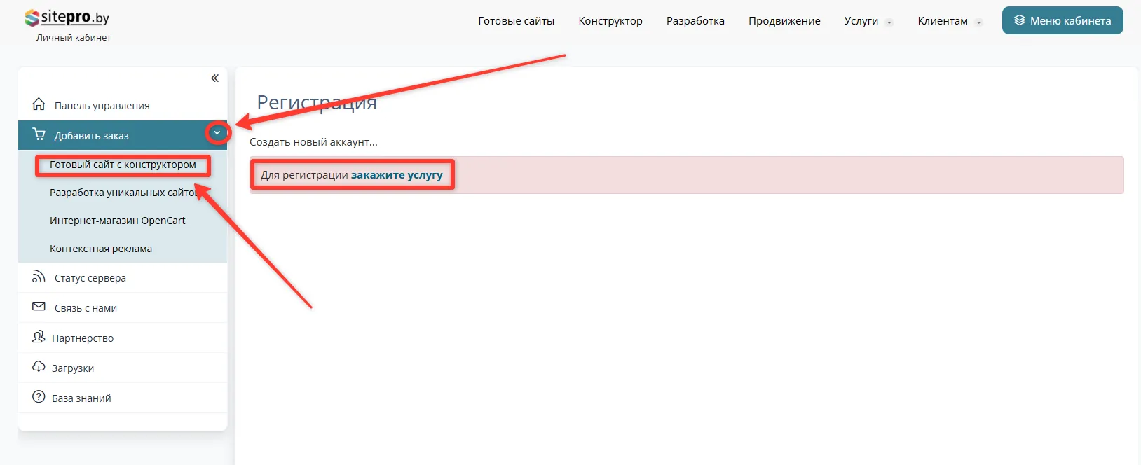 3. Далее из выпадающего списка "Добавить заказ", выберите интересующую Вас услугу