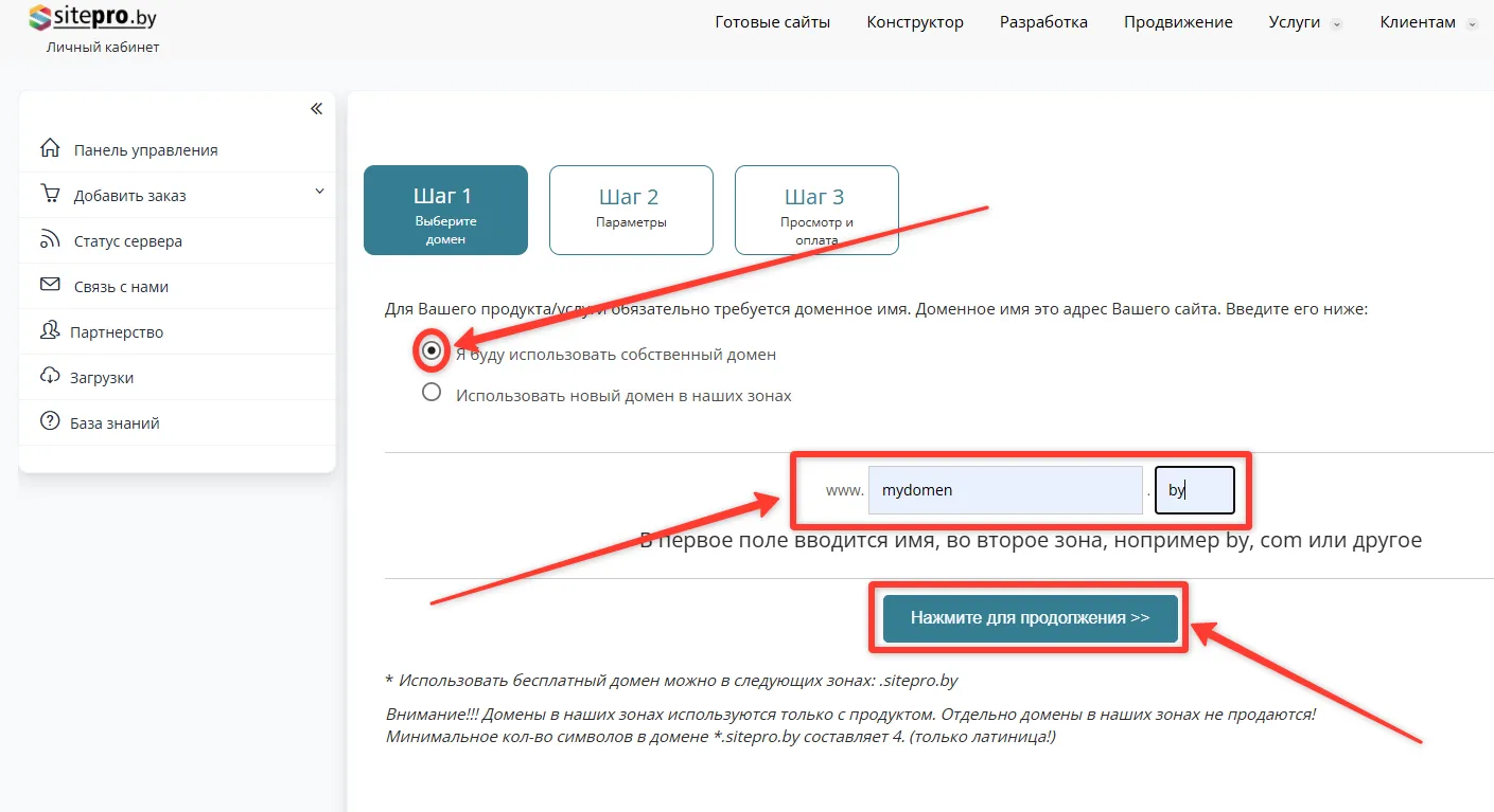 5. Введите название своего или домена в зонах sitepro.by и нажмите кнопку "Продолжить"