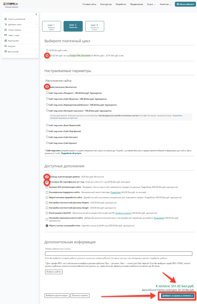 6. Выберите платёжный цикл и необходимые Вам опции, после чего нажмите "Добавить в корзину и оплатить"
