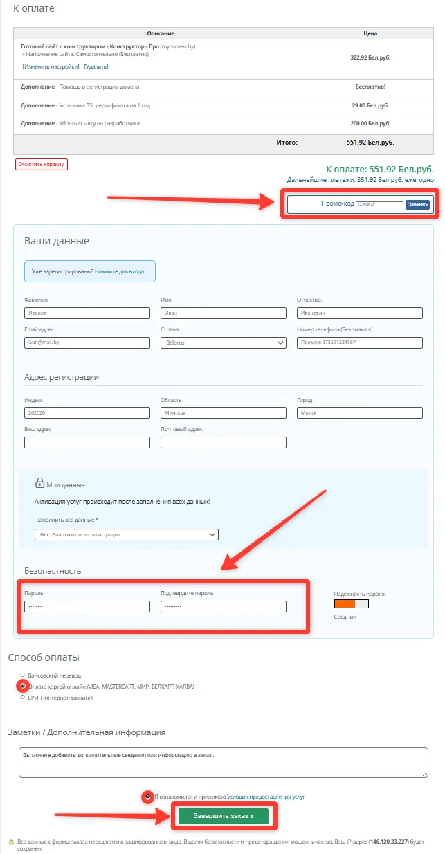 7. Заполните все поля как указано в примере со скриншота и нажмите "Завершить заказ"