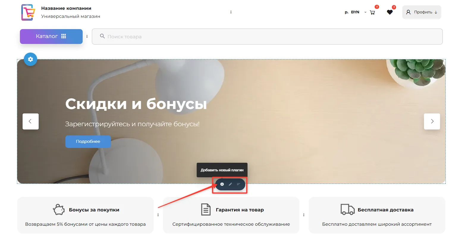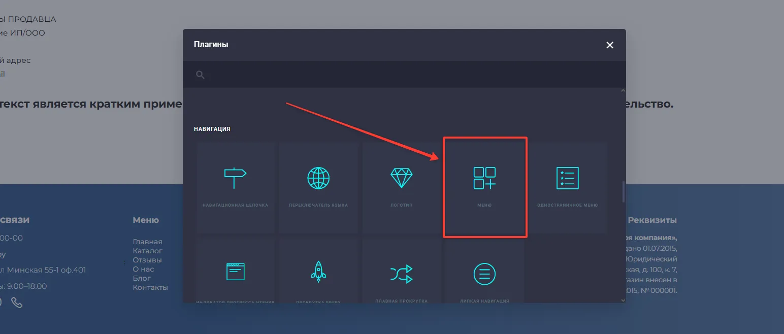 Выберите блок для вставки и нажмите "Добавить новый плагин"