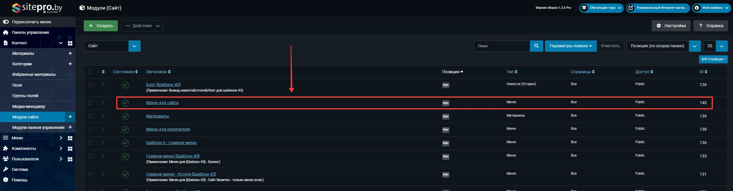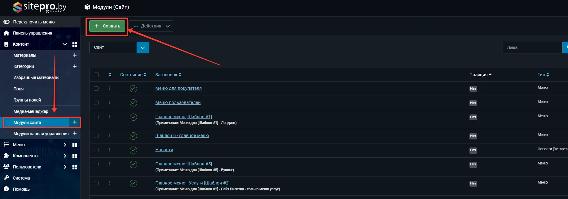 CMS модули сайта находятся по пути: Контент → Модули сайта → Создать
