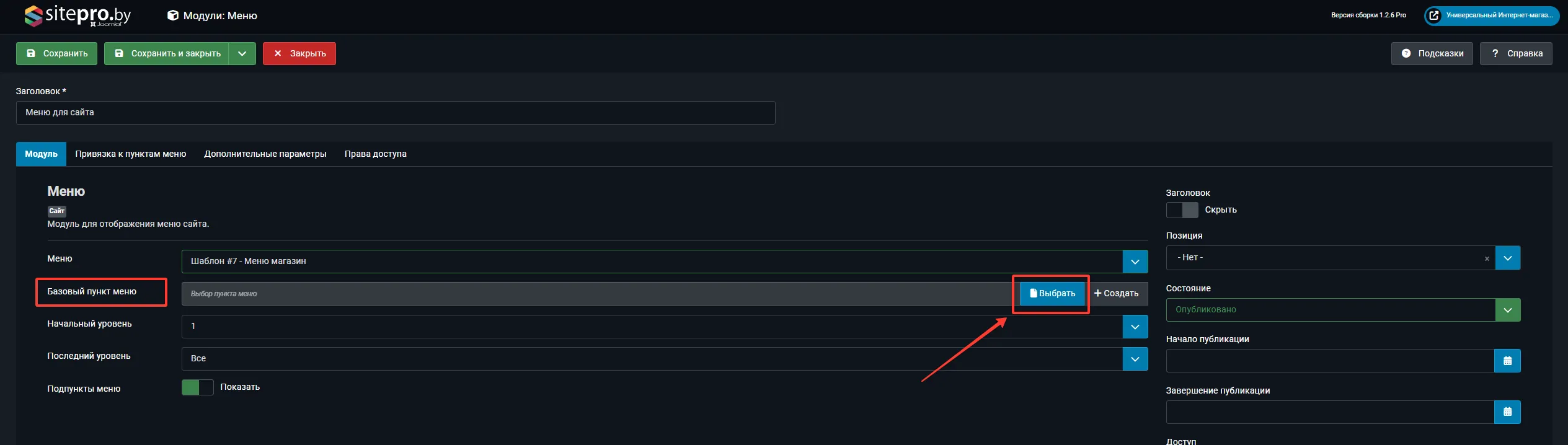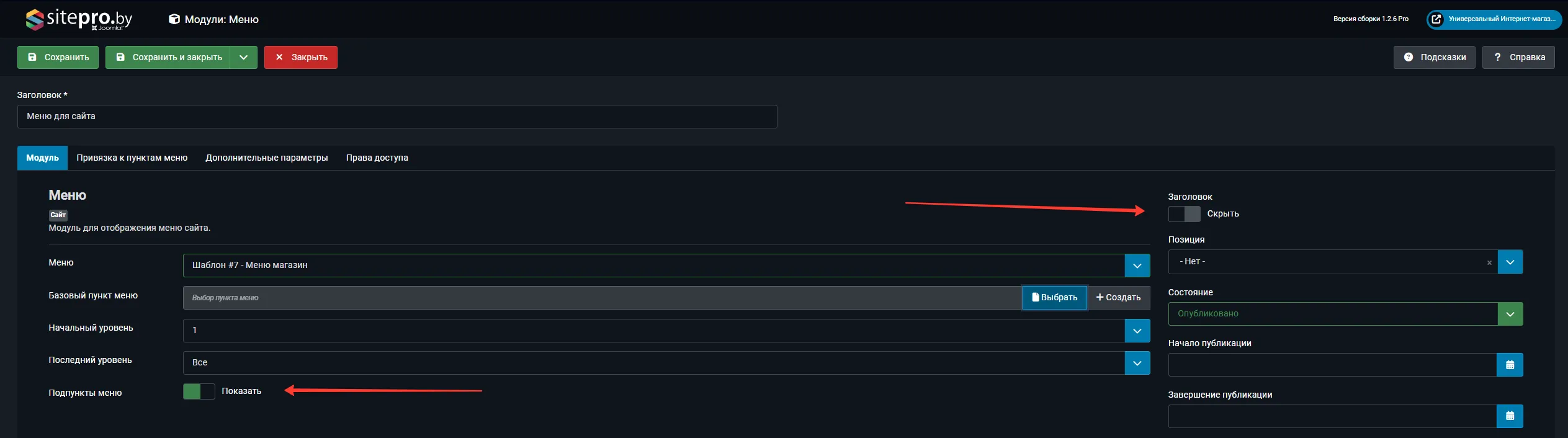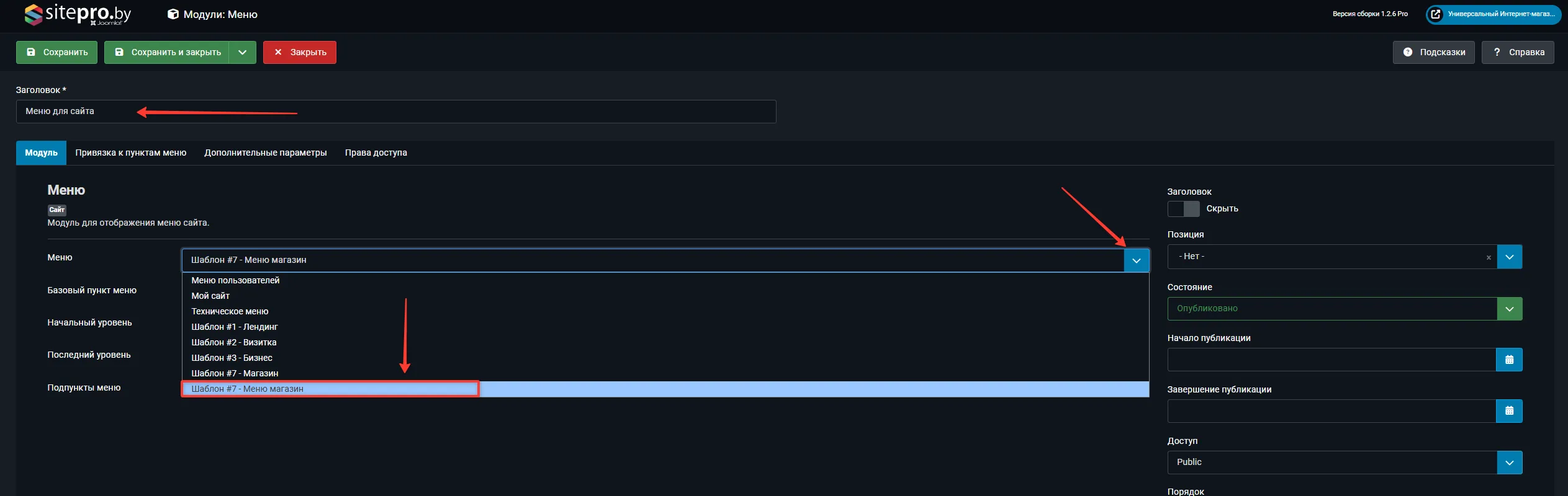 Пишем заголовок для модуля, из выпадающего меню выбираем меню нашего сайта