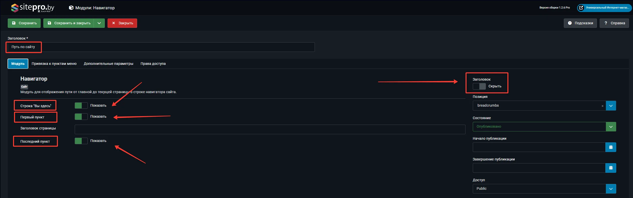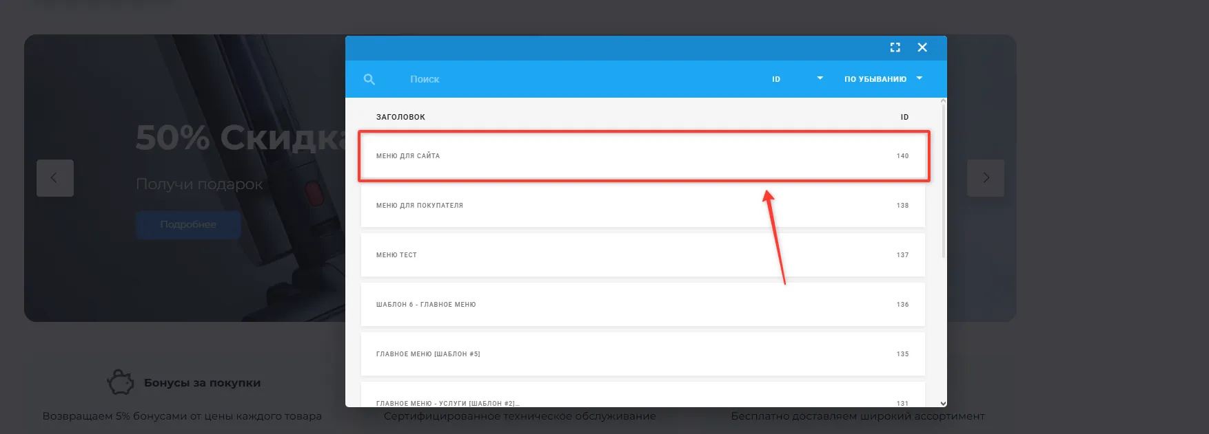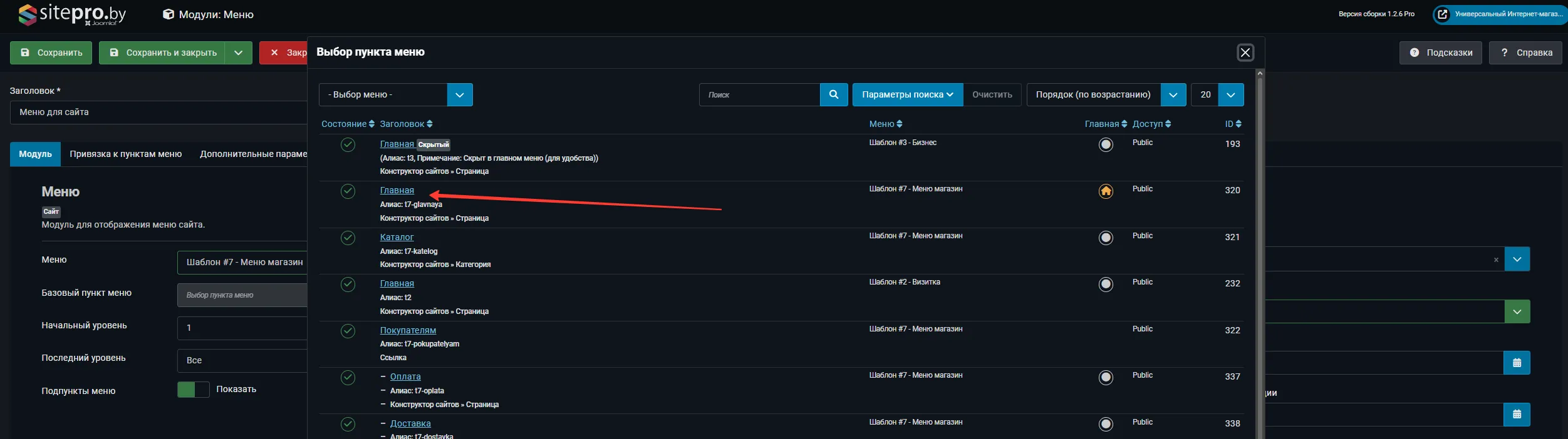 Пишем заголовок для модуля, из выпадающего меню выбираем меню нашего сайта