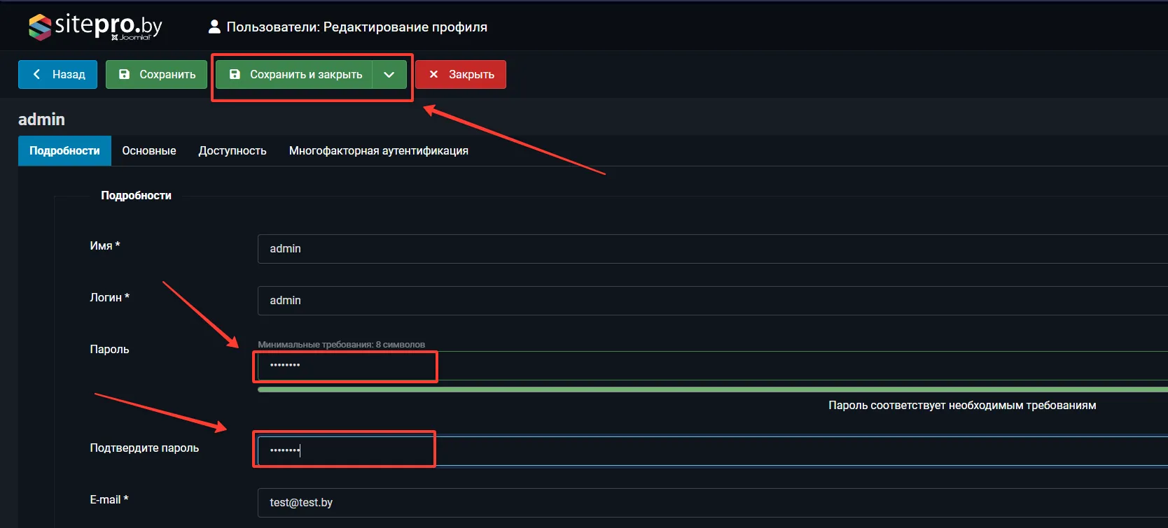 Введите новый пароль в поле "Пароль", и в поле "Подтверждение пароля", затем нажмите кнопку "Сохранить и закрыть"