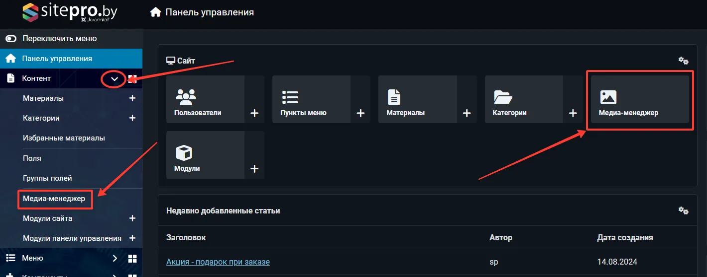Зайти в медиа-менеджер можно двумя способами указанными на скриншоте