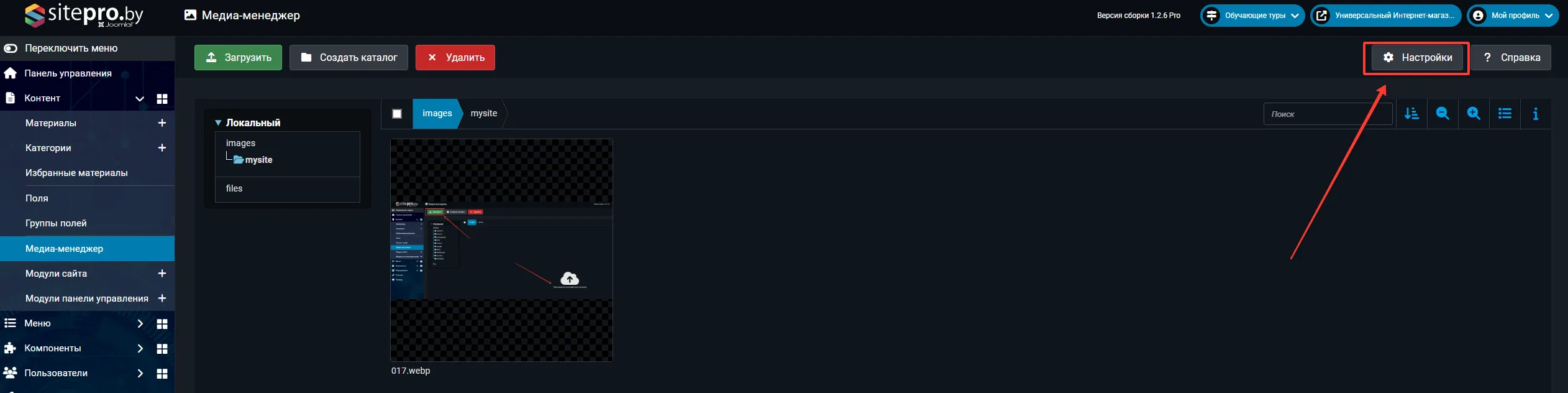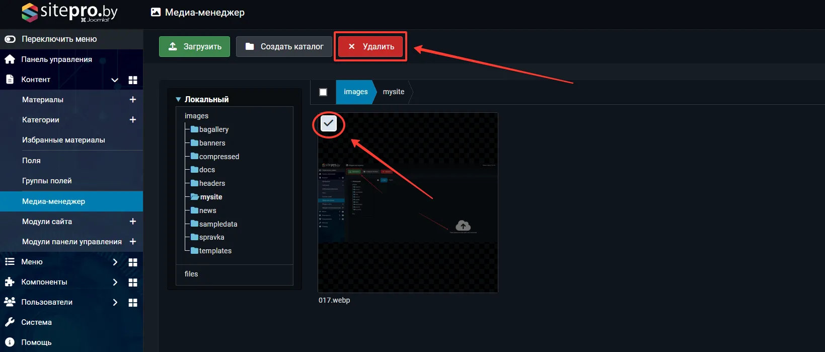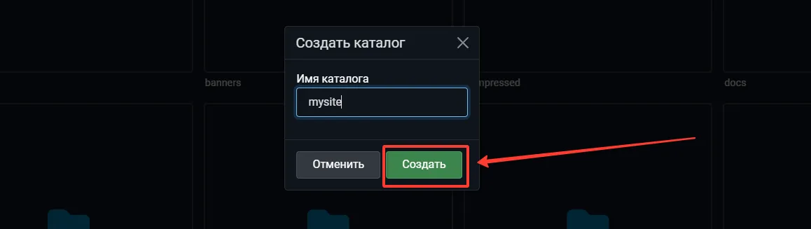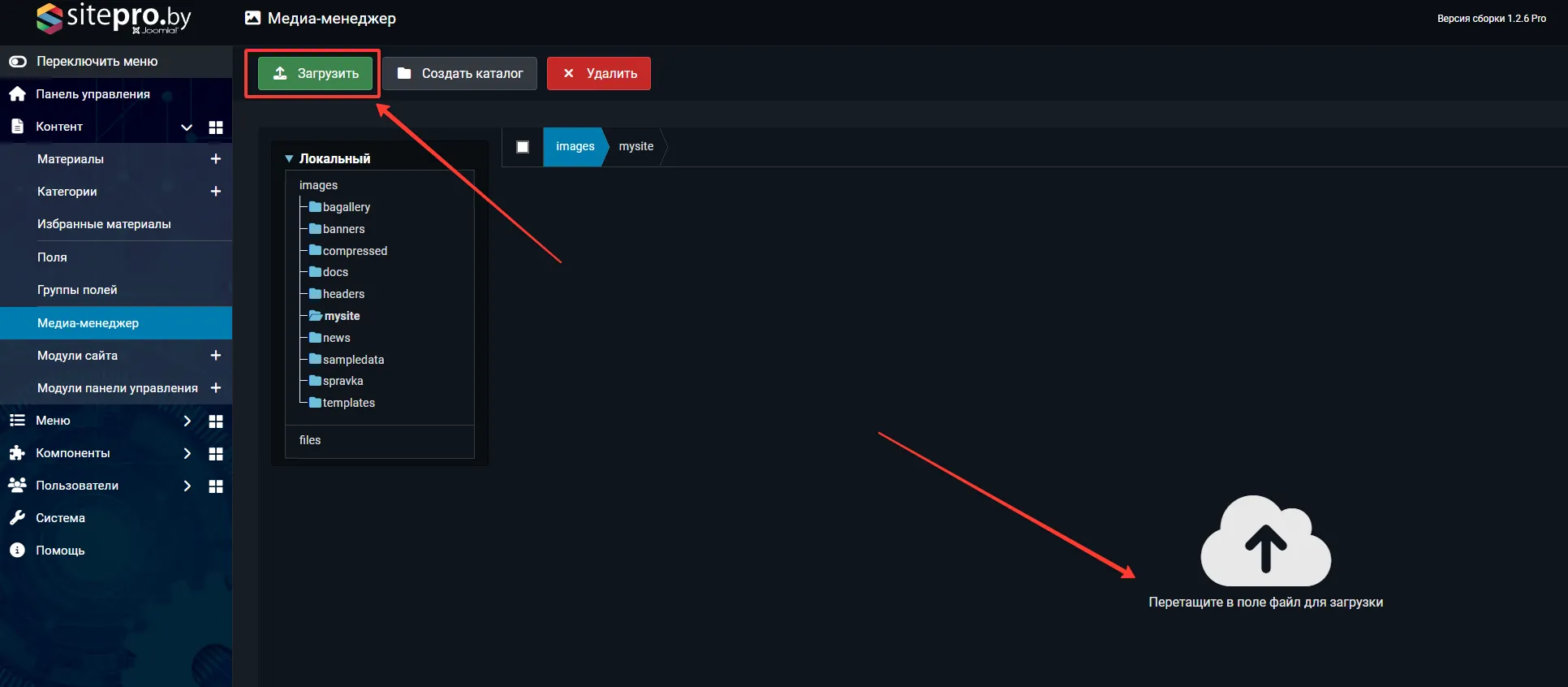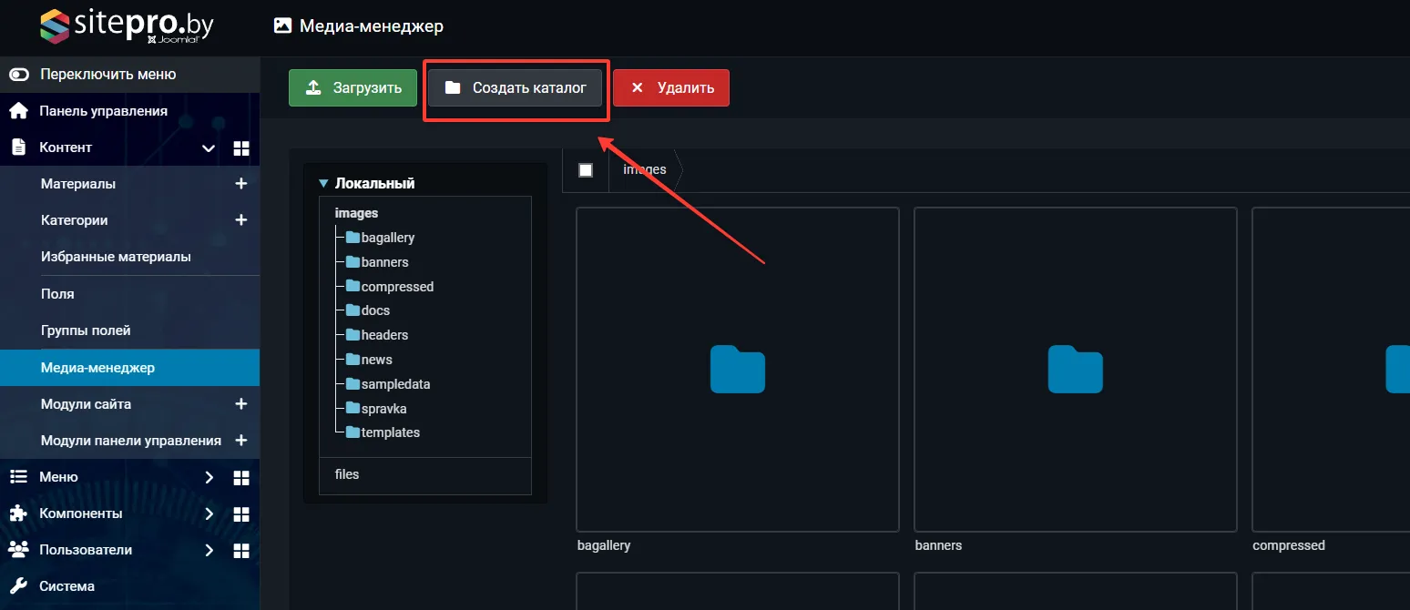 С помощью медиа-менеджера Вы можете создавать папки, загружать на сайт картинки, видео и документы. Чтобы создать новую папку, нажмите кнопку "Создать каталог"