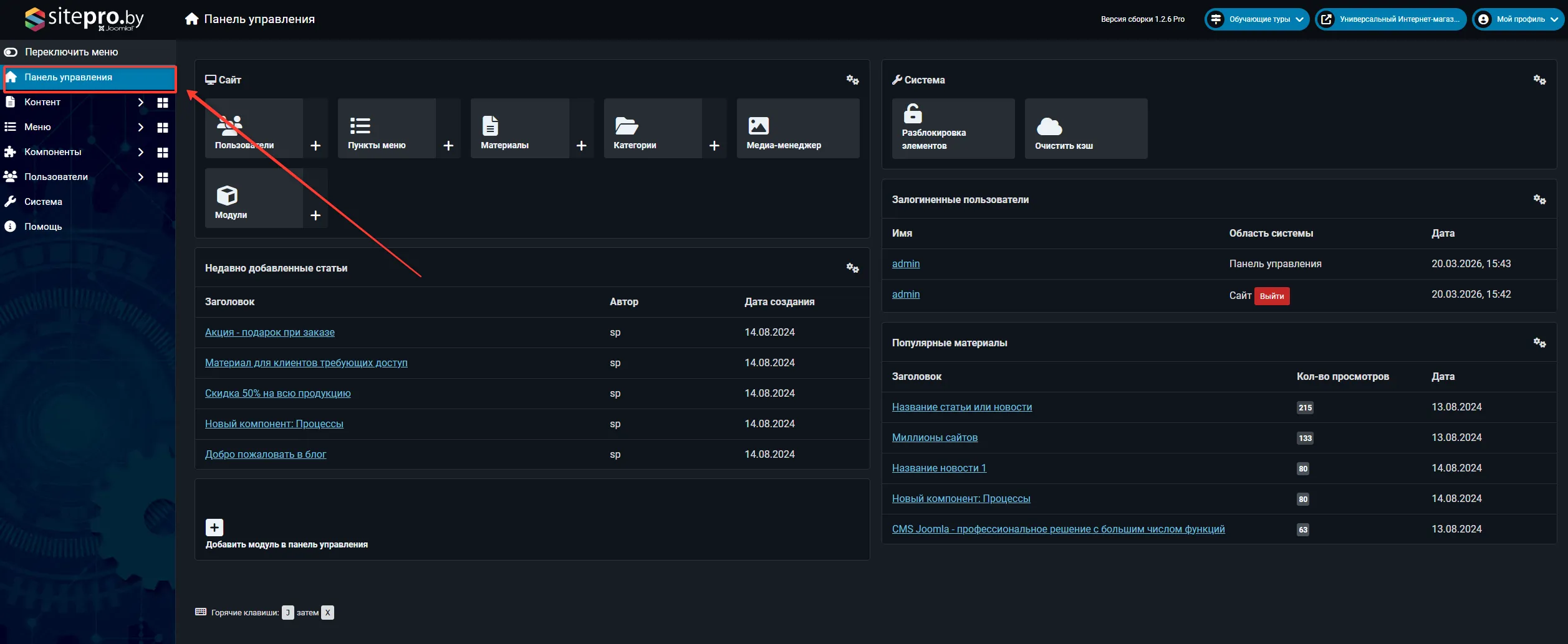 Если логин и пароль введен правильно, вы попадёте в панель управления сайтом (CMS)