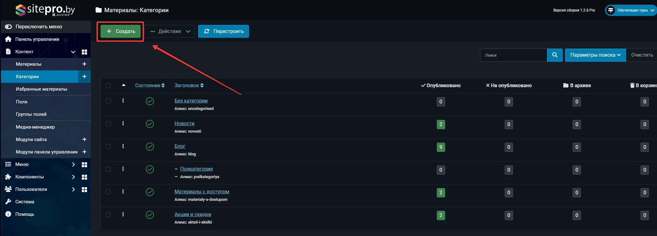 Нажмите кнопку "Создать"