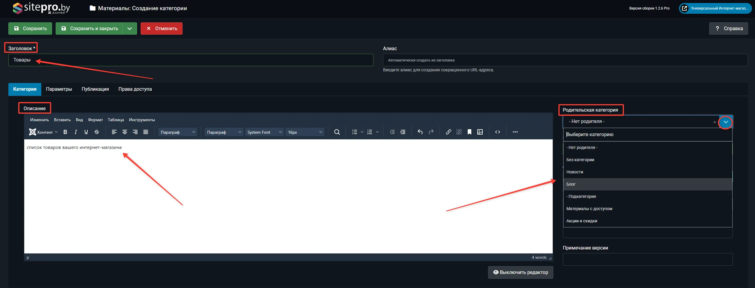 В поле "Заголовок" введите название категории, в поле "Описание" можно добавить текст с описанием категории, так-же можно выбрать родительскую категорию