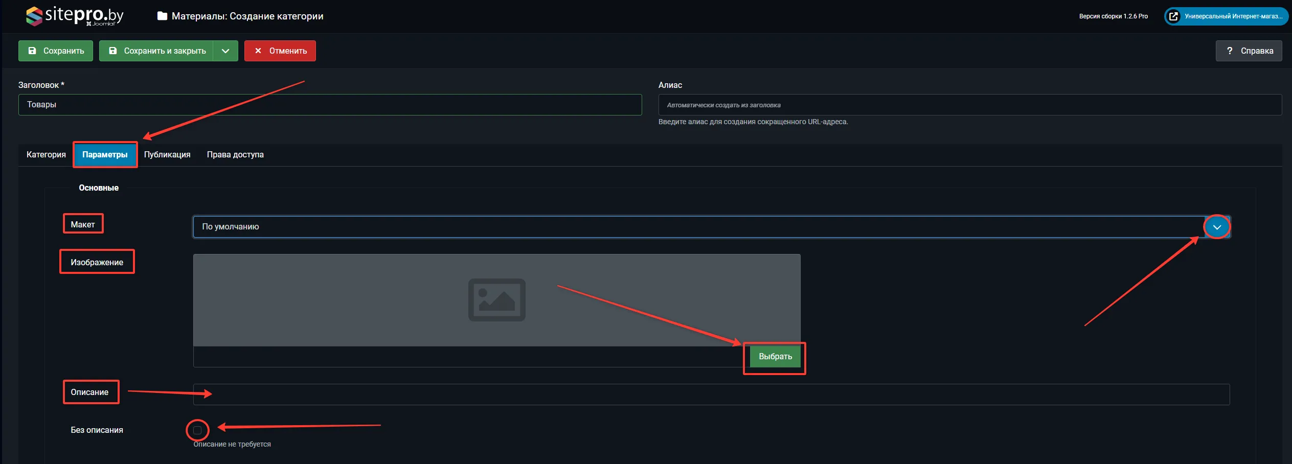 В закладке "Параметры" можно выбрать макет из выпадающего списка, добавить изображение для категории, написать описание