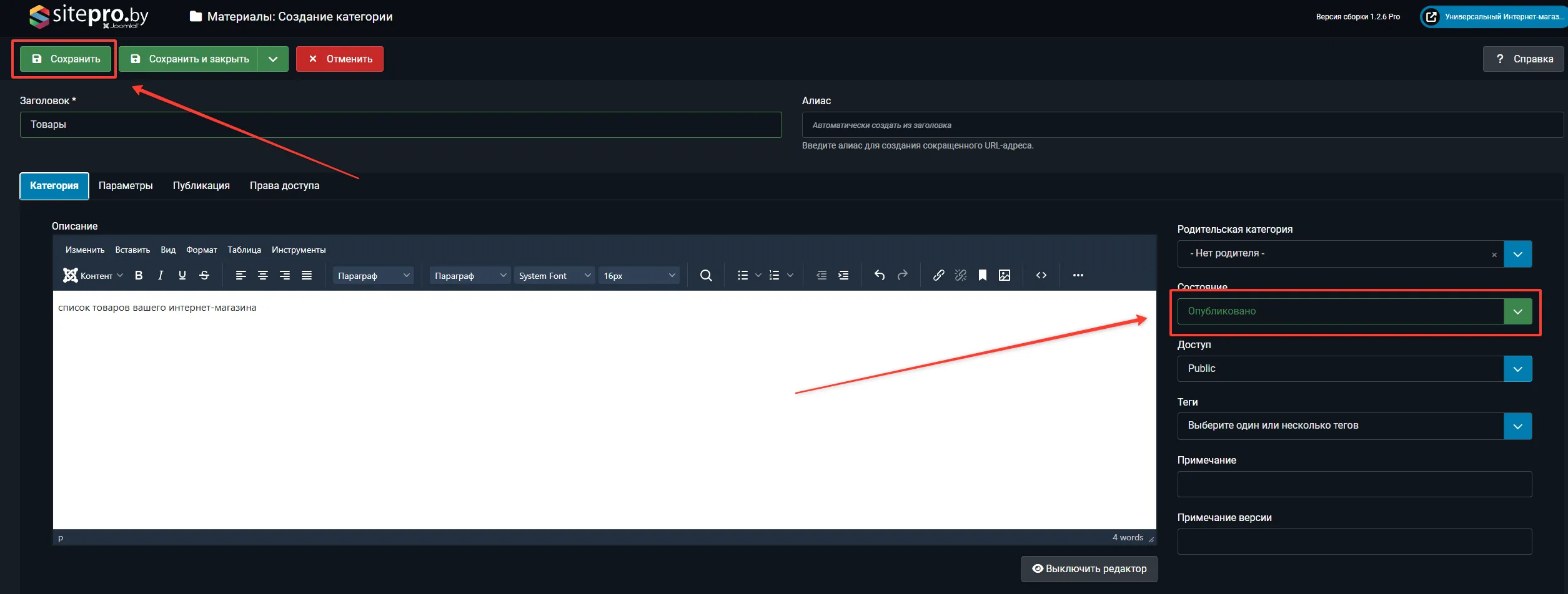 Выберите состояние "Опубликовано" и нажмите "Сохранить"