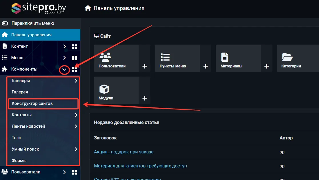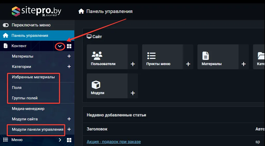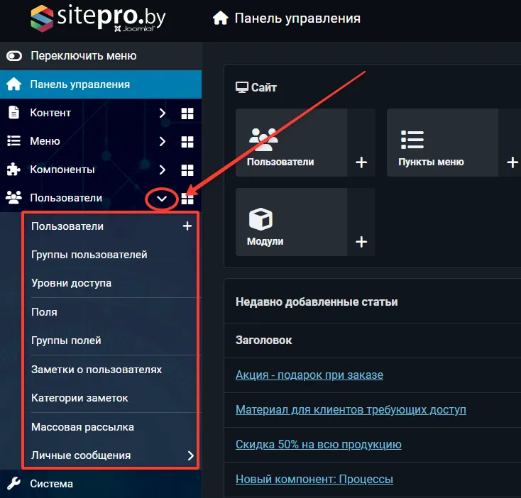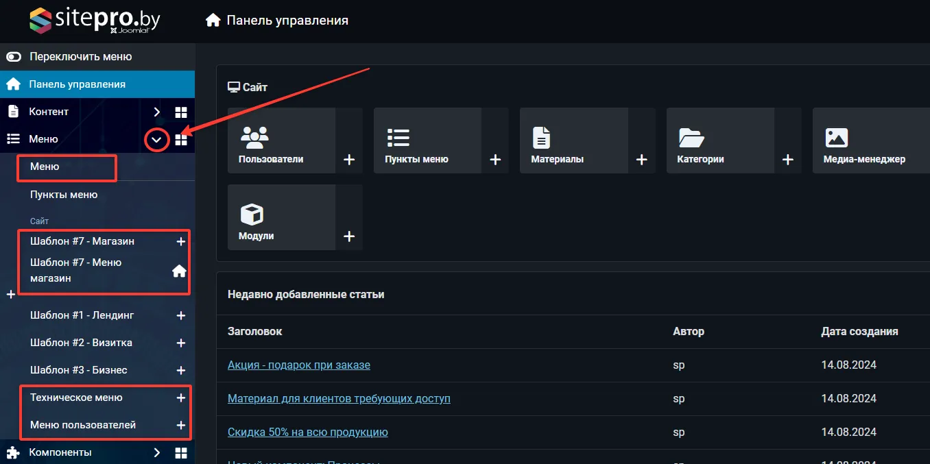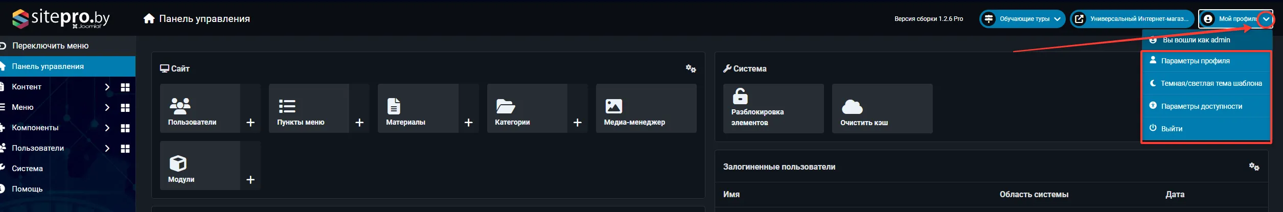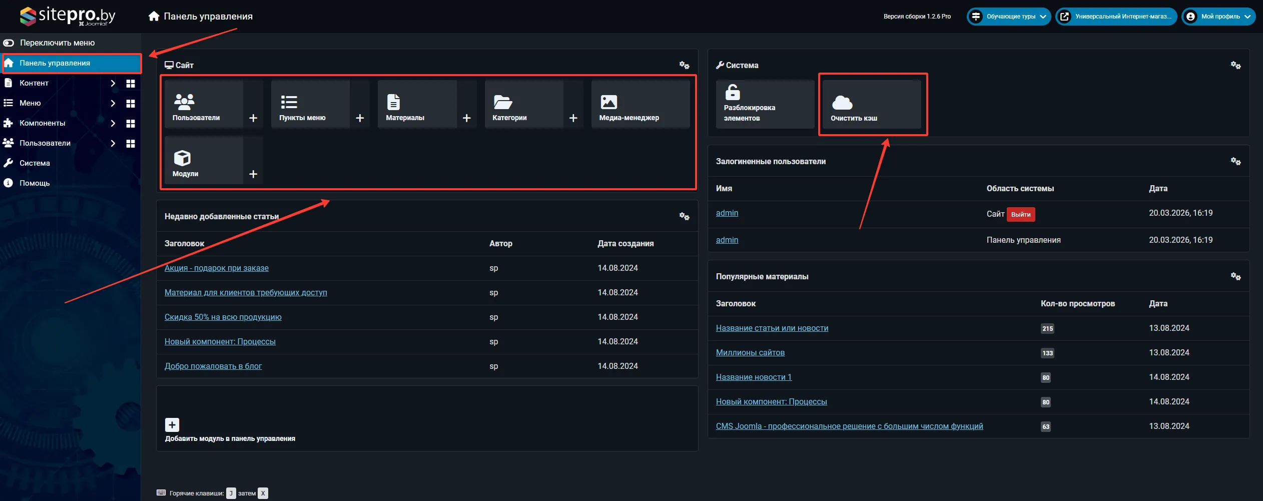 В панели управления Вы можете быстро переключаться между различными пунктами административного меню, очистить кэш, быстро перейти в медиа-менеджер, материалы, меню, модули и пользователи сайта