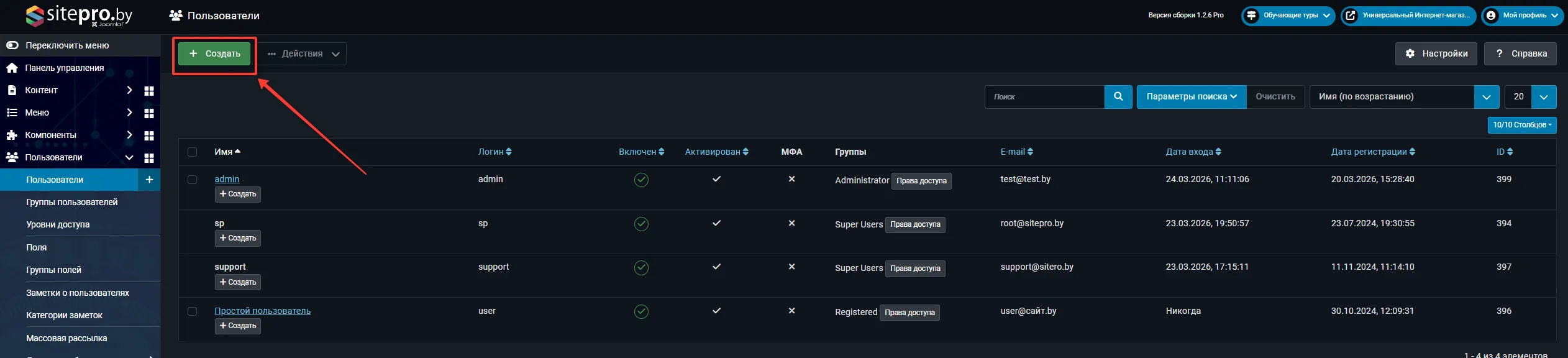 В админ-панели перейдите в раздел Пользователи → Создать.