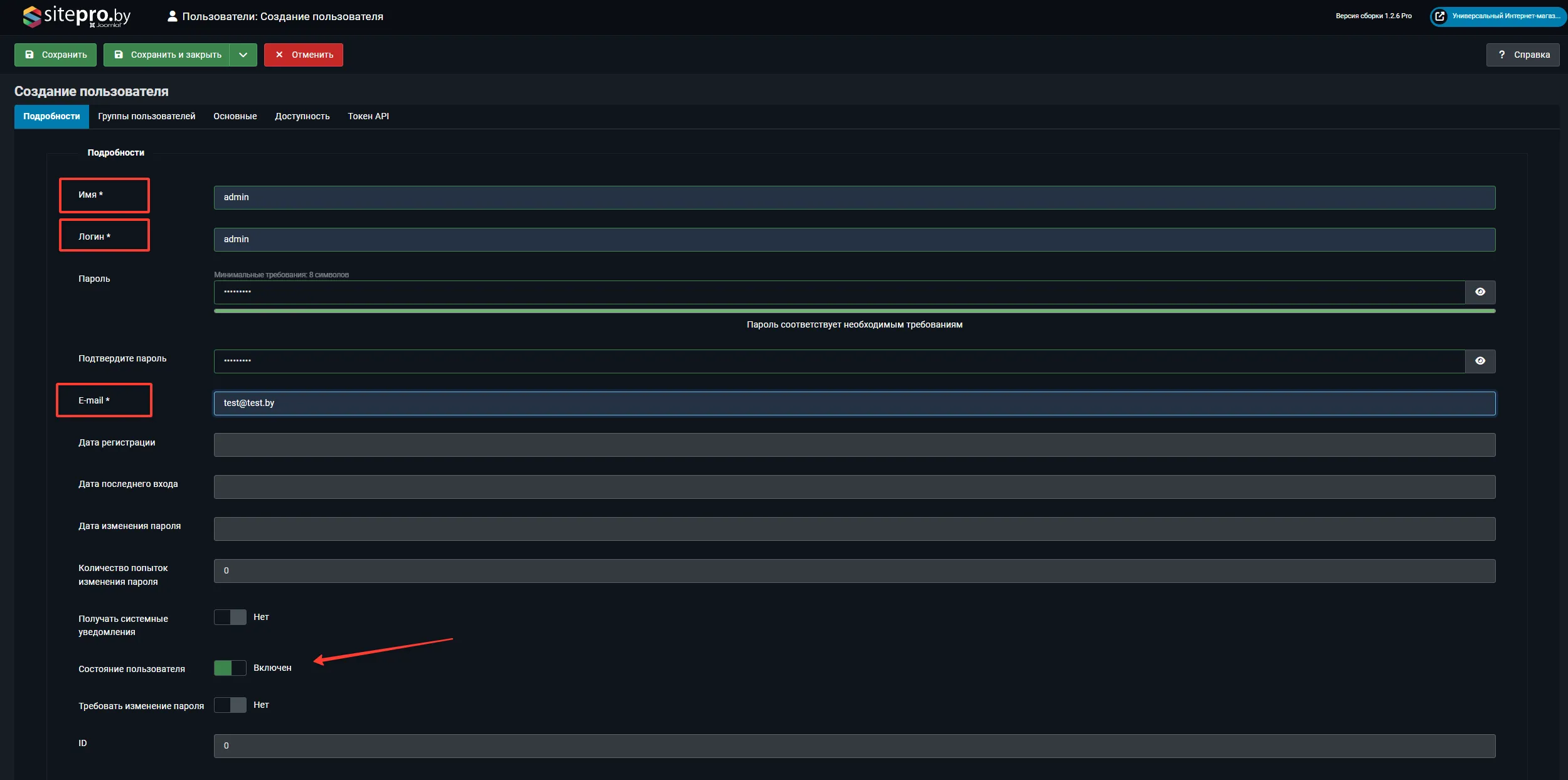 Нажмите Сохранить. Пользователь получит письмо с данными для входа (если включена отправка уведомлений).