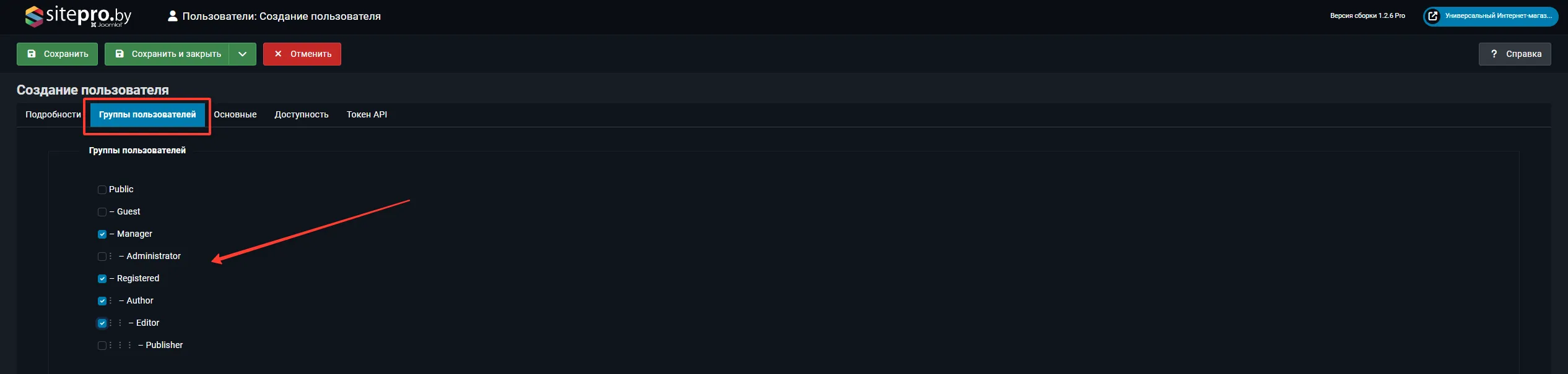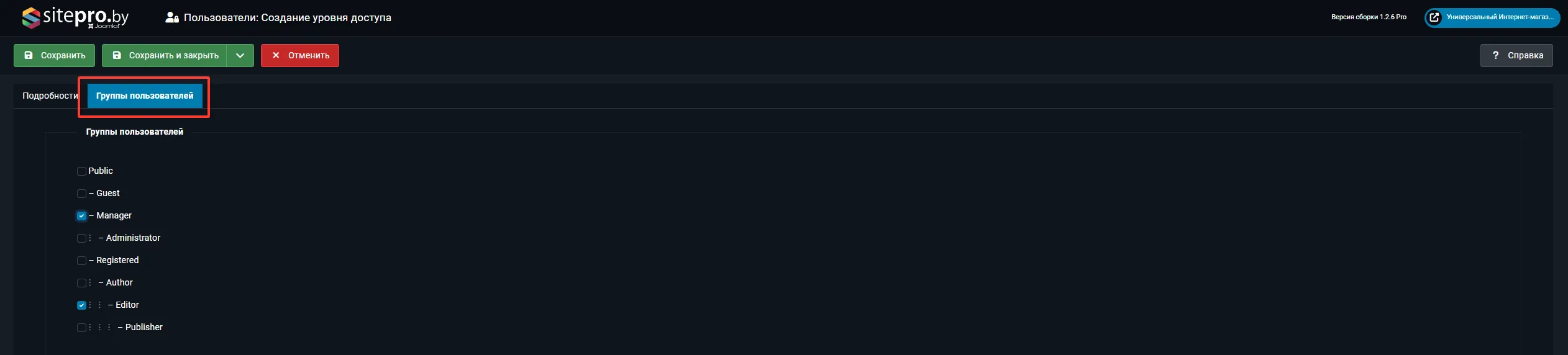 В блоке Группы пользователей, имеющие доступ отметьте нужные группы (например, «Редактор», «Издатель»).и созраните изменения