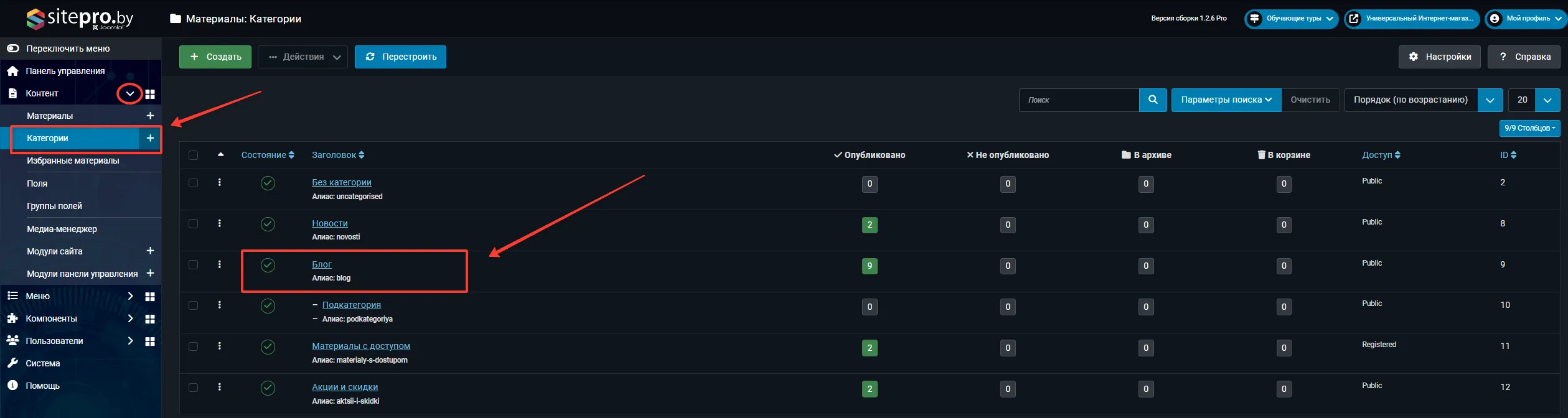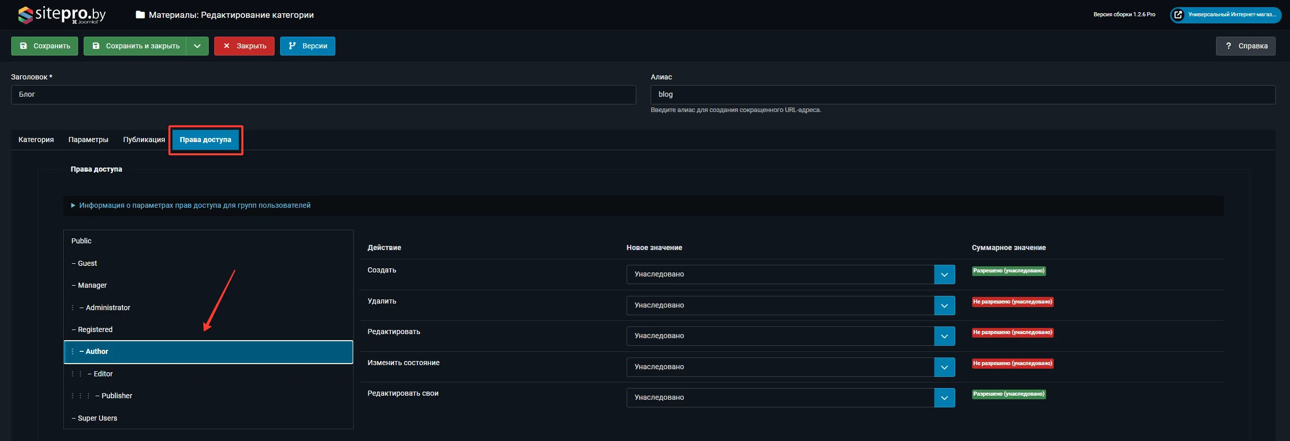 В Контент → Категории откройте категорию «Блог», перейдите на вкладку Права доступа: