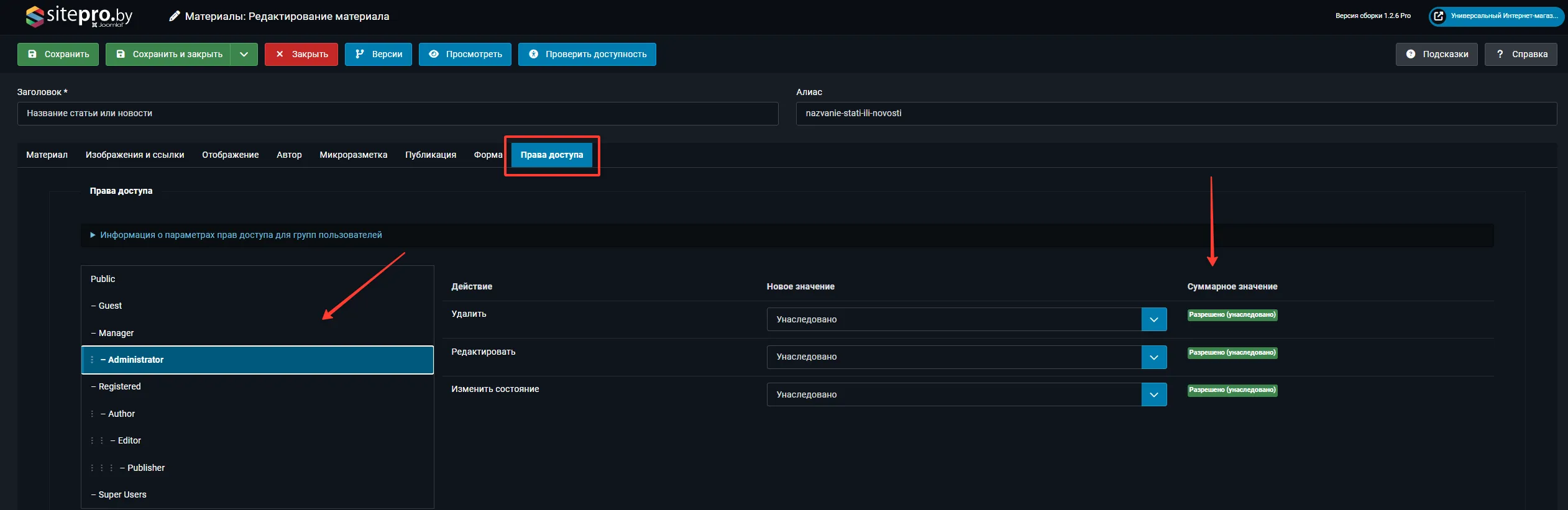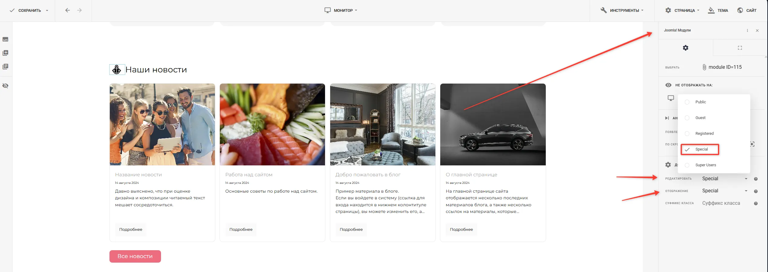 - В статьях: в поле «Доступ» при редактировании материала выберите созданный уровень — контент будет виден только пользователям из соответствующих групп.
