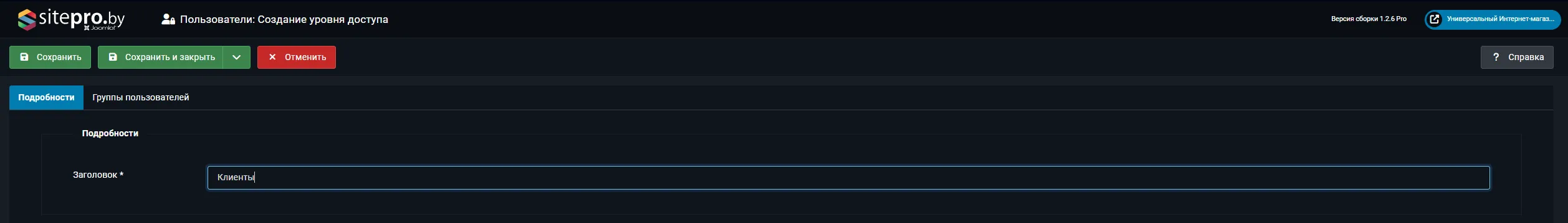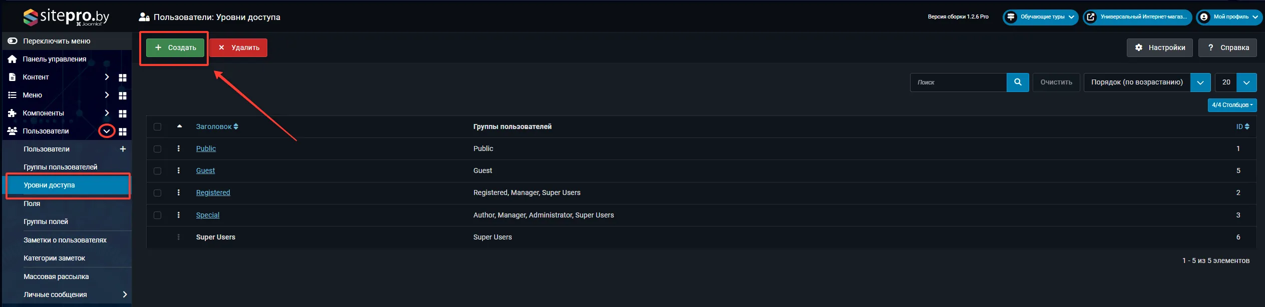 Перейдите в Пользователи → Уровни доступа → Создать.