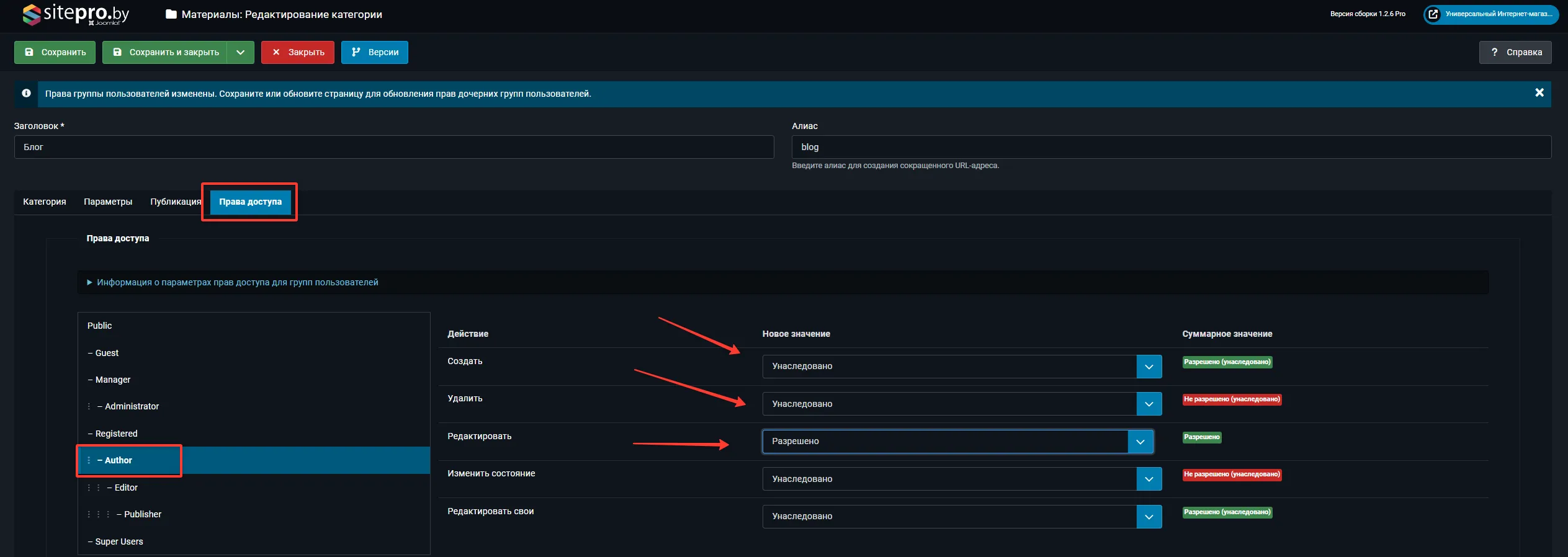Для группы «Автор» установите: Создание — Разрешено, Редактирование — Разрешено (свои), Удаление — Запрещено.