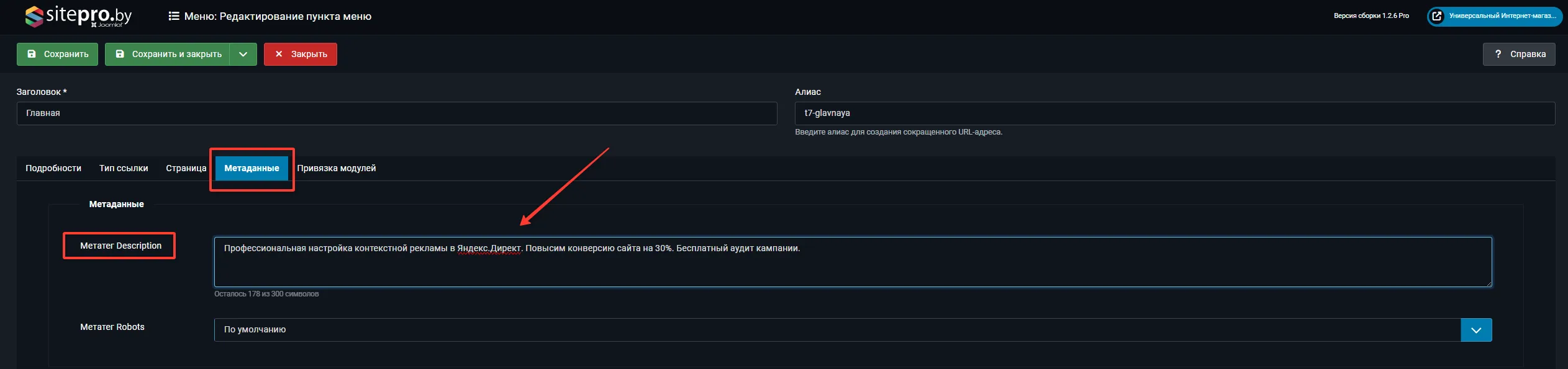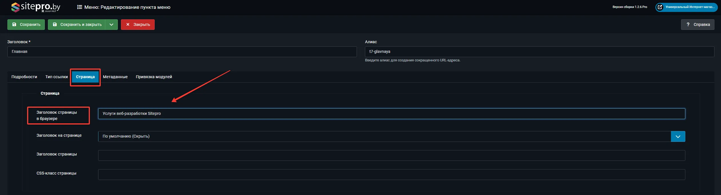 Чтобы открыть параметры оптимизации, перейдите в административной панели по пути: Меню → [Ваше меню] → выберите пункт меню → вкладка «Страница»