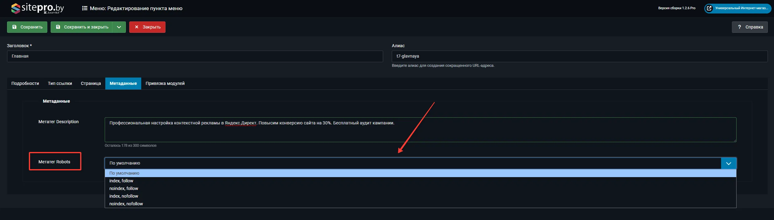 Этот параметр управляет индексацией страницы поисковыми ботами. Доступны четыре комбинации: